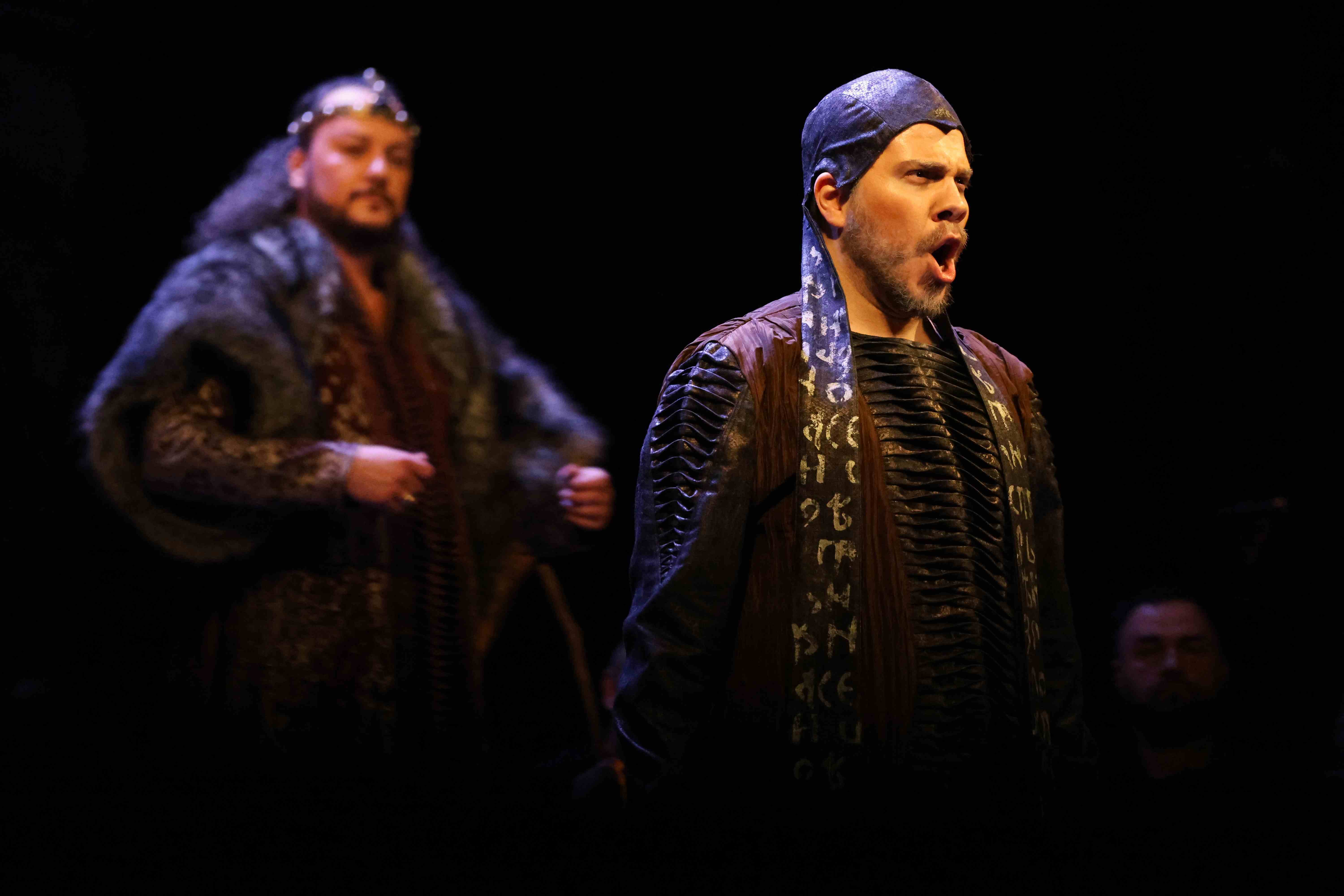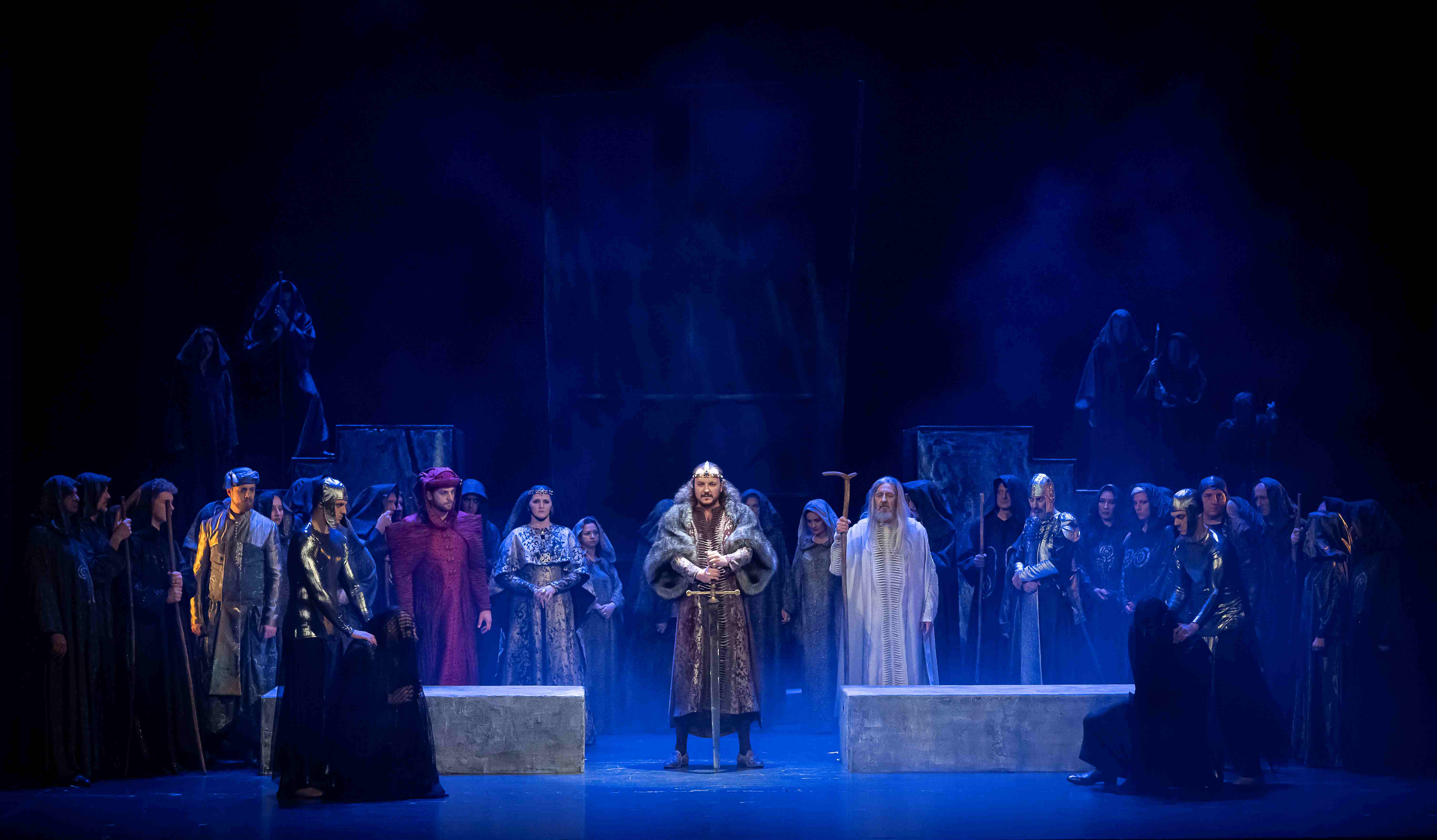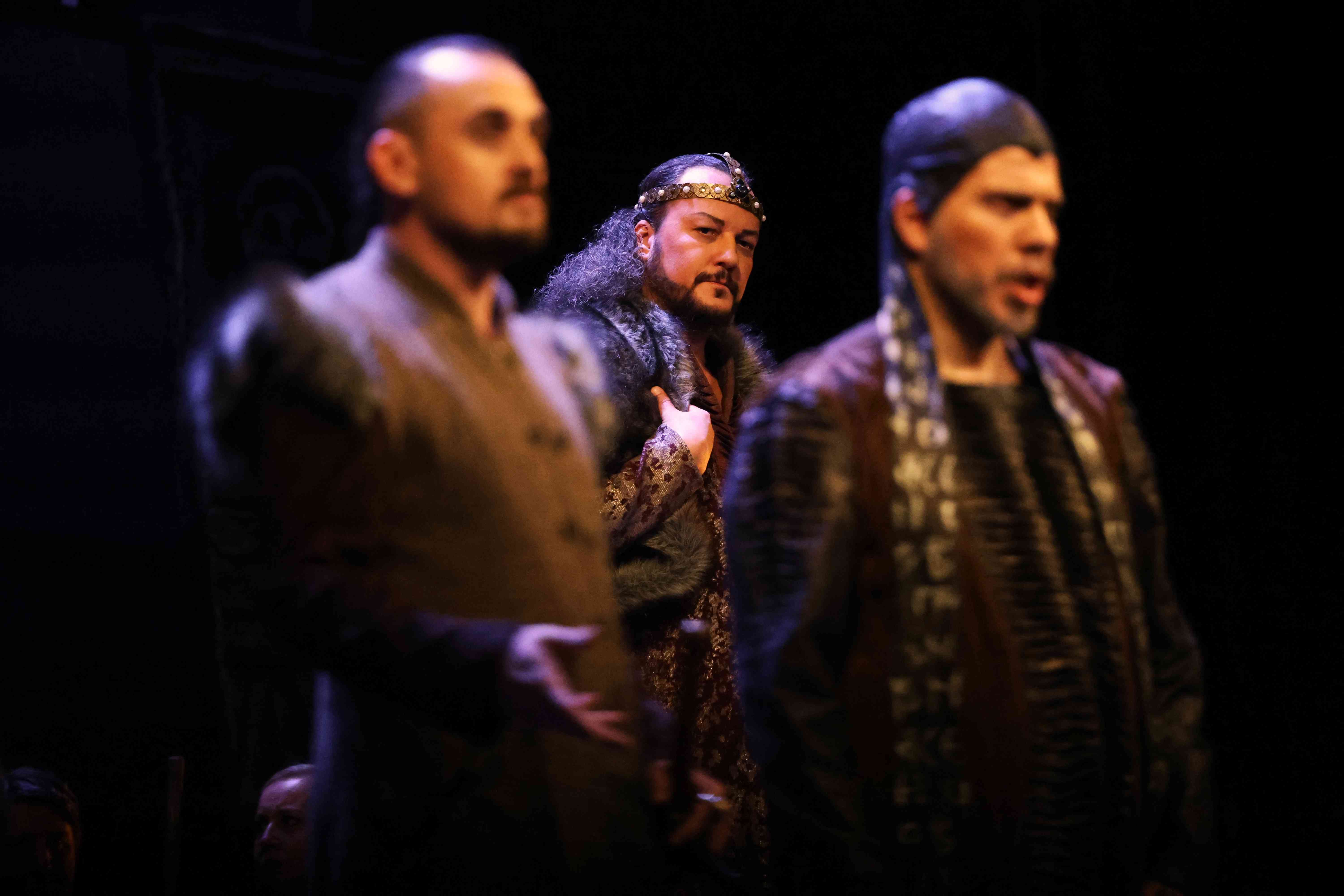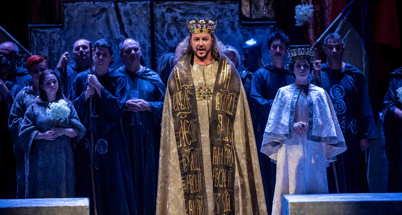 Naslovnu ulogu Tvrtka iznio je solista Opere NPS Ivan Šarić; Grubaču, Tvrtkovu nevjenčanu suprugu utjelovila je Amila Ravkić; u ulozi kneginje Jelene, Tvrtkove majke slušali smo Katarinu Kikić Marić; dok je Doroteju, kraljicu bosansku utjelovila Hana Salihović. Amir Saračević igrao je ulogu Vuka Tvrtkovog brata; Ileš Bečei lik Vuka Dabišića, plemića, zavjerenika protiv Tvrtka. Solista Opere Erol Ramadanović iznio je lik Hotjana, Tvrtkovog savjetnika. Did bosanski, poglavar Crkve bosanske je Leonardo Šarić; Vlatko Hranić, bosanski vitez i velikaš Denis Isaković.