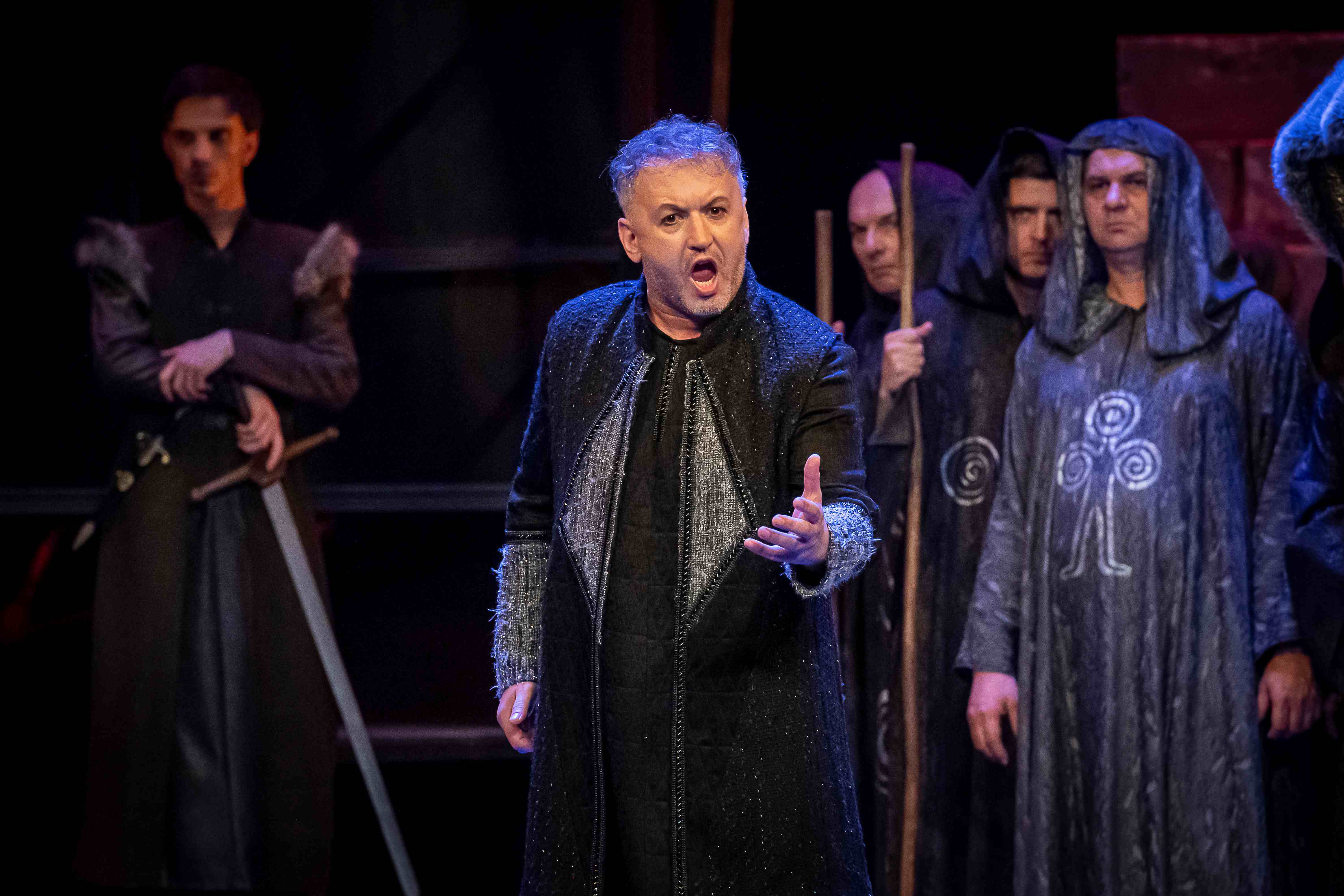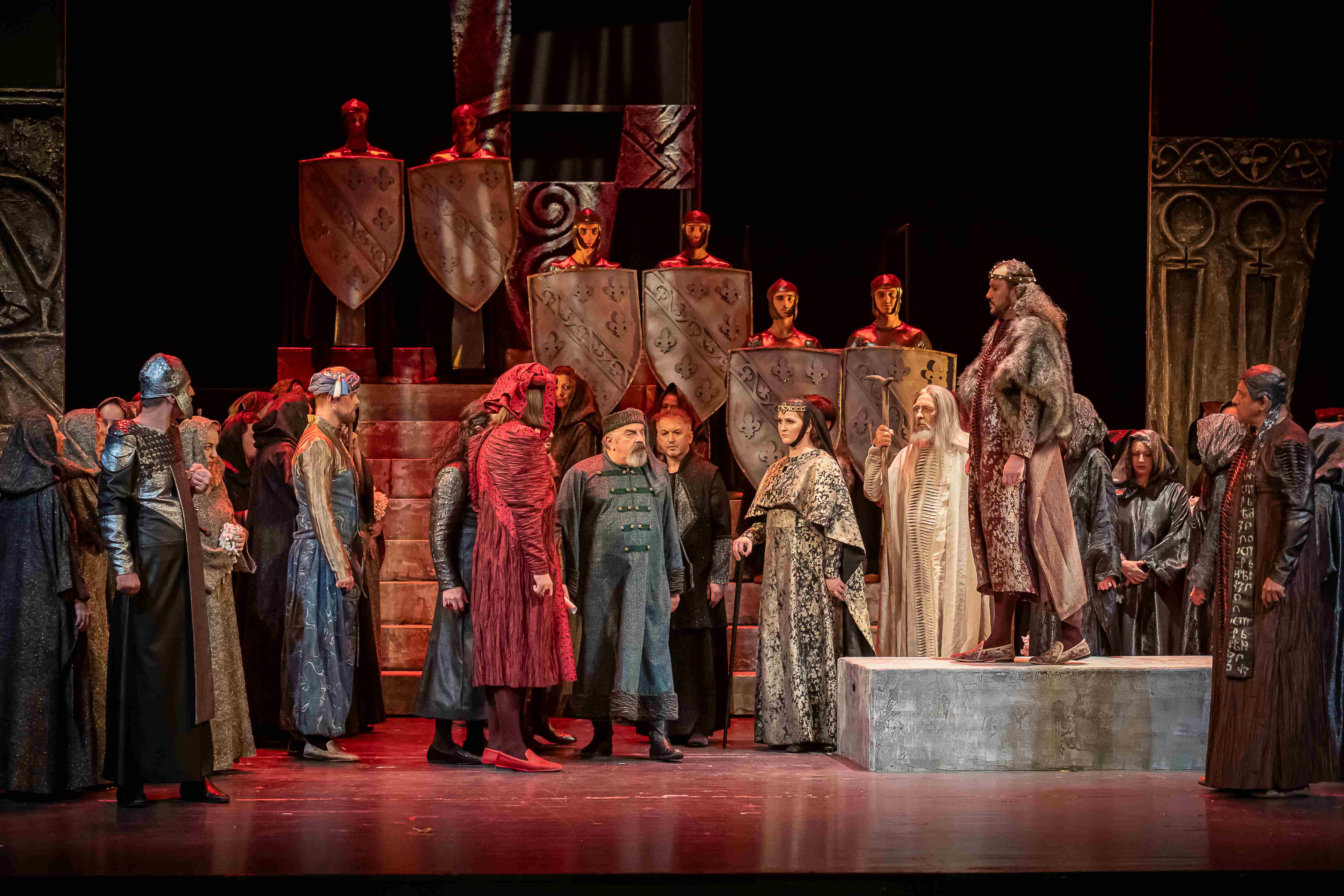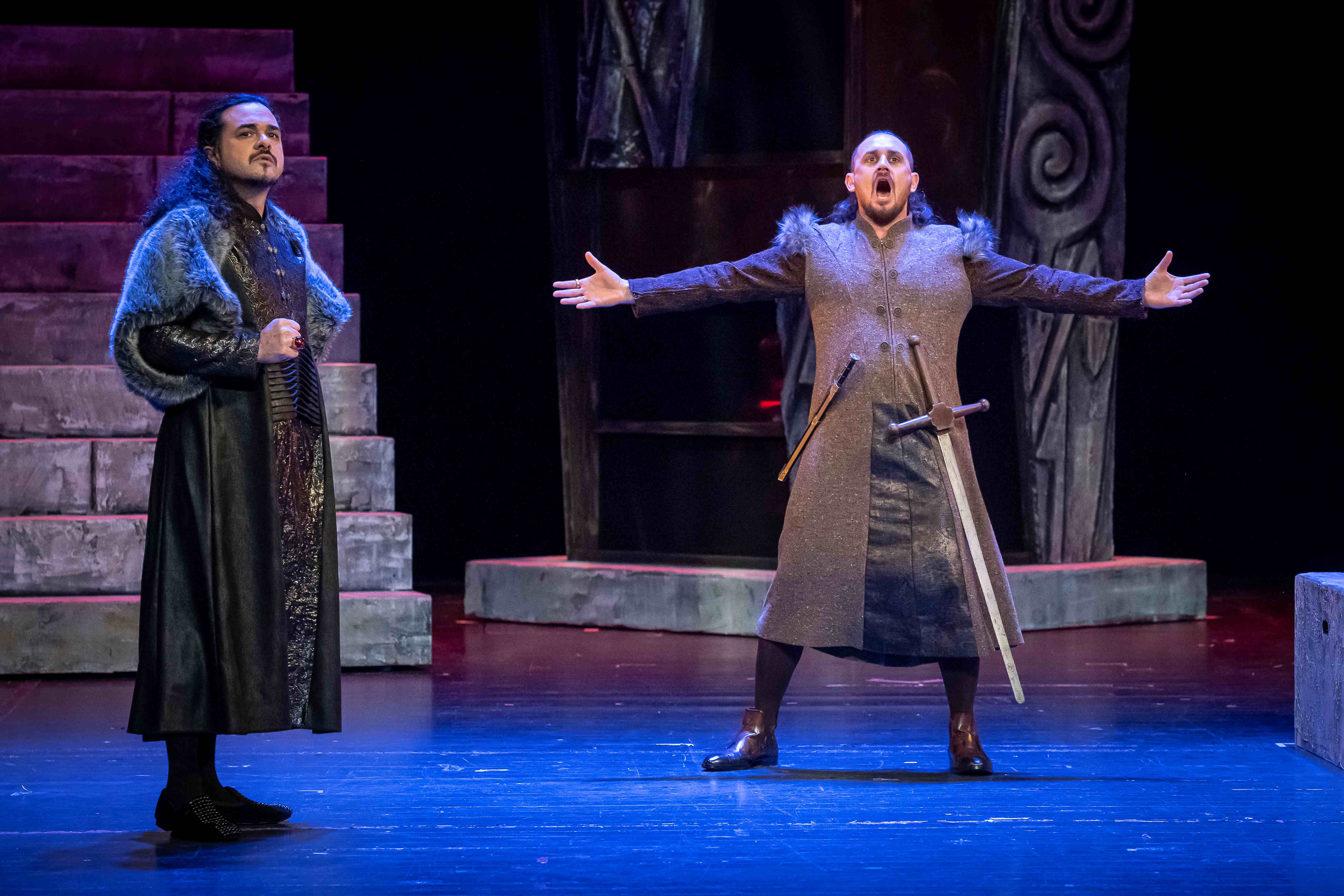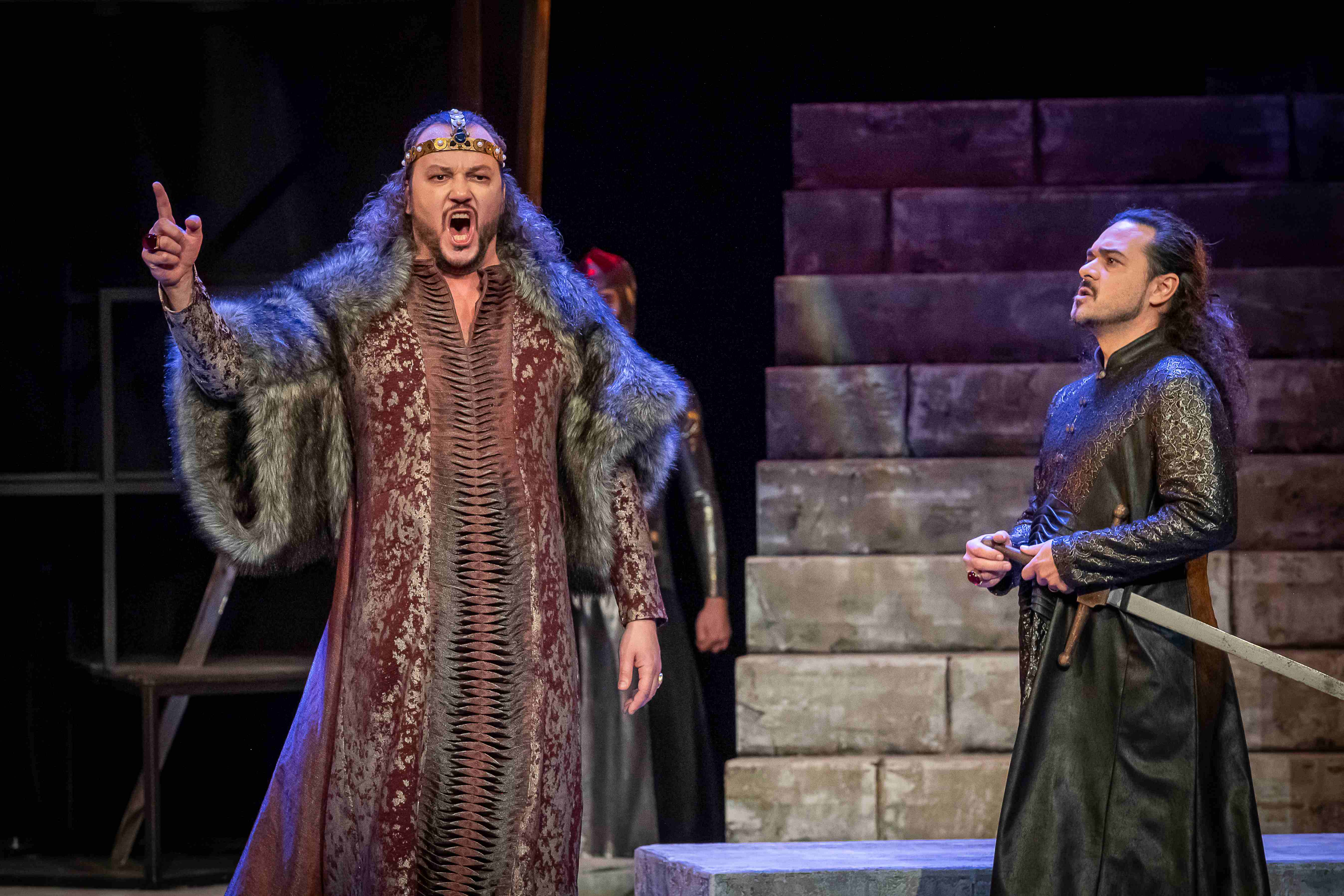 Naslovnu ulogu Tvrtka iznio je solista Opere NPS Ivan Šarić; Grubaču, Tvrtkovu nevjenčanu suprugu utjelovila je Amila Ravkić; u ulozi kneginje Jelene, Tvrtkove majke slušali smo Katarinu Kikić Marić; dok je Doroteju, kraljicu bosansku utjelovila Hana Salihović. Amir Saračević igrao je ulogu Vuka Tvrtkovog brata; Ileš Bečei lik Vuka Dabišića, plemića, zavjerenika protiv Tvrtka. Solista Opere Erol Ramadanović iznio je lik Hotjana, Tvrtkovog savjetnika. Did bosanski, poglavar Crkve bosanske je Leonardo Šarić; Vlatko Hranić, bosanski vitez i velikaš Denis Isaković.
